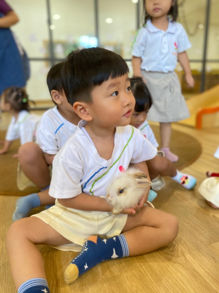 During the activity, teachers guided the students to learn about rabbits’ body parts, food, and habits. The children were encouraged to gently touch and feed the rabbits while learning how to treat animals with kindness and care. Through simple explanations and interactive discussions, the students developed curiosity and empathy toward animals.