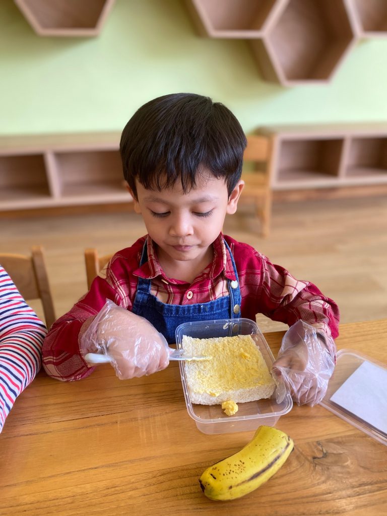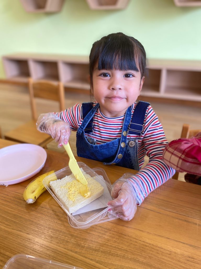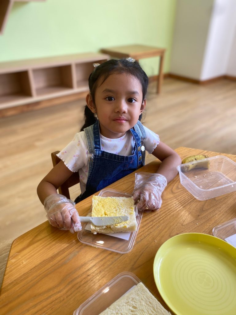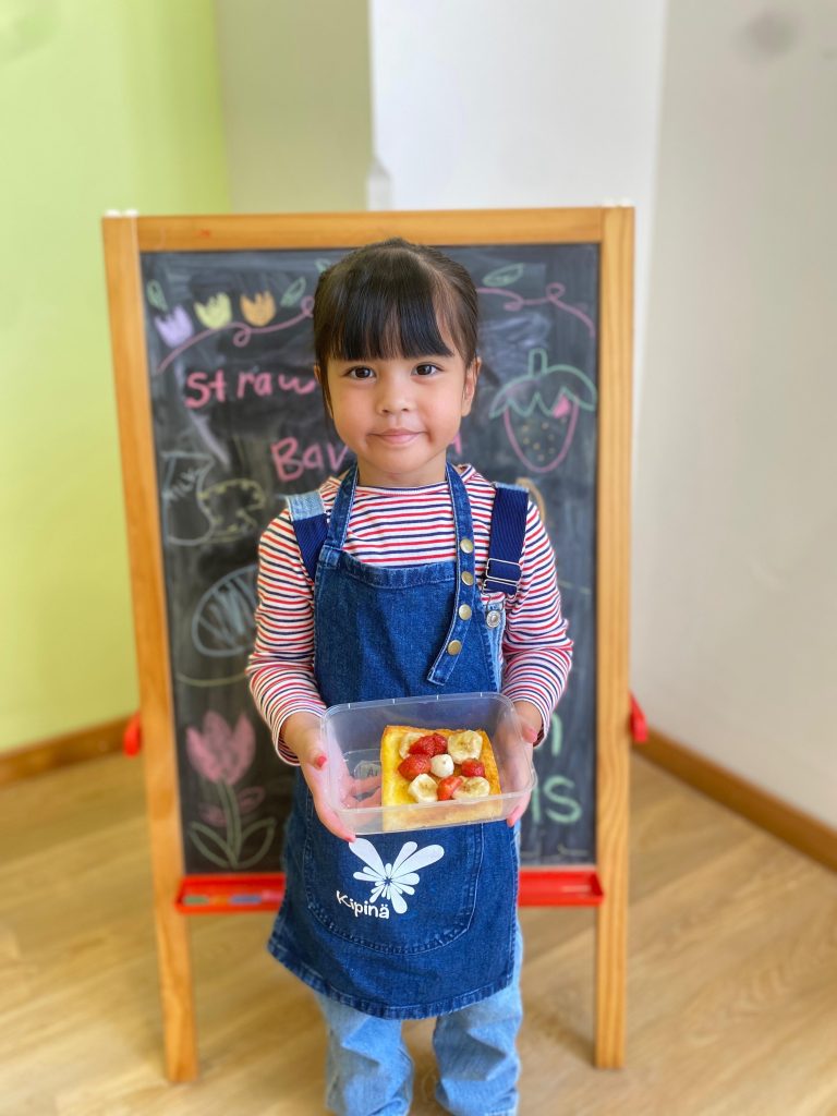 During the cooking class, the students learned step-by-step how to spread, slice, and arrange bananas and strawberries on toast with guidance from their teachers. They also talked about the taste, color, and texture of each ingredient, helping to build vocabulary and sensory awareness. Safety and hygiene were emphasized, with children learning the importance of washing hands and using utensils properly before cooking.