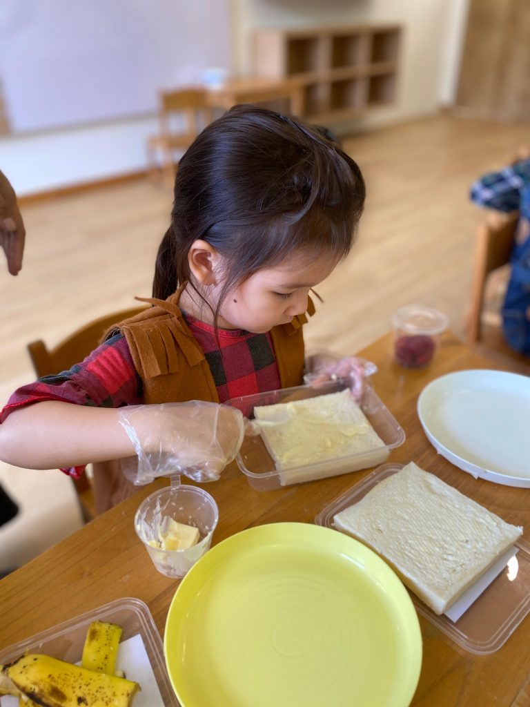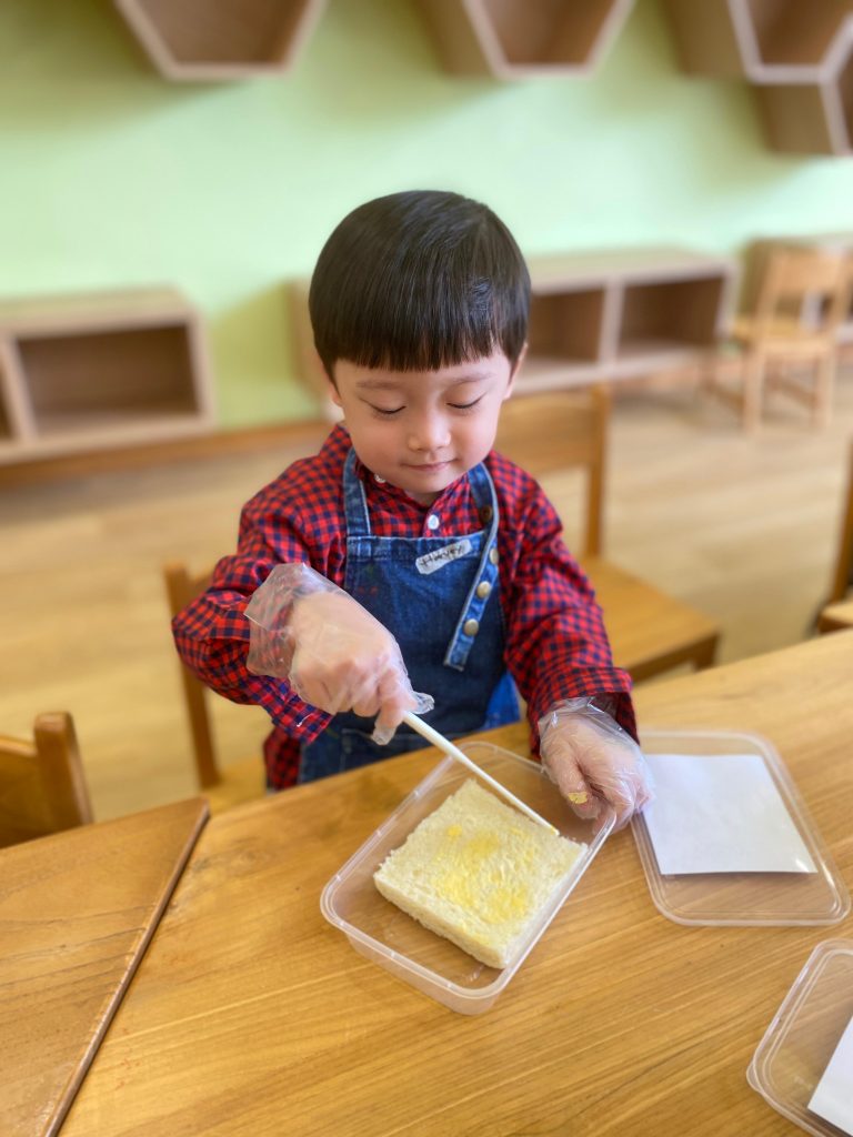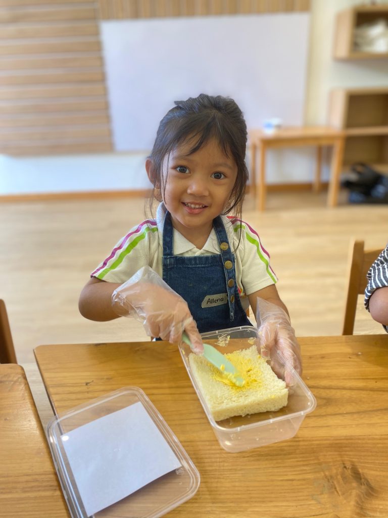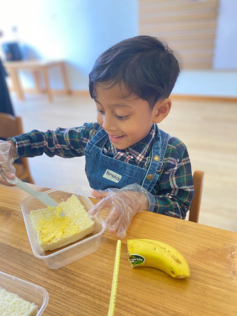 During the cooking class, the students learned step-by-step how to spread, slice, and arrange bananas and strawberries on toast with guidance from their teachers. They also talked about the taste, color, and texture of each ingredient, helping to build vocabulary and sensory awareness. Safety and hygiene were emphasized, with children learning the importance of washing hands and using utensils properly before cooking.