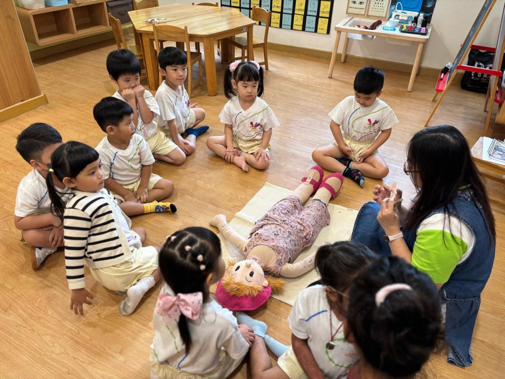 During the activity, children took part in doctor role play, using medical props such as stethoscopes, medical kits, and dolls as patients. They practiced checking heartbeats, identifying body parts, and providing gentle care, encouraging empathy and responsibility toward others.