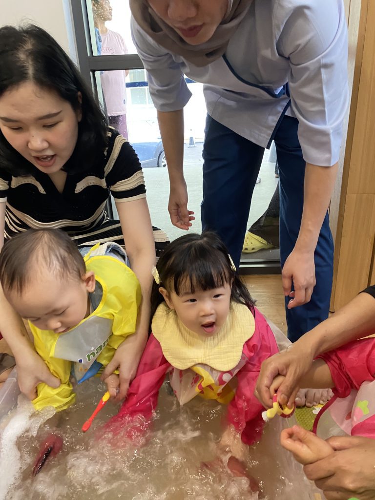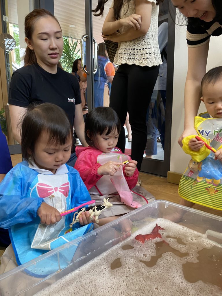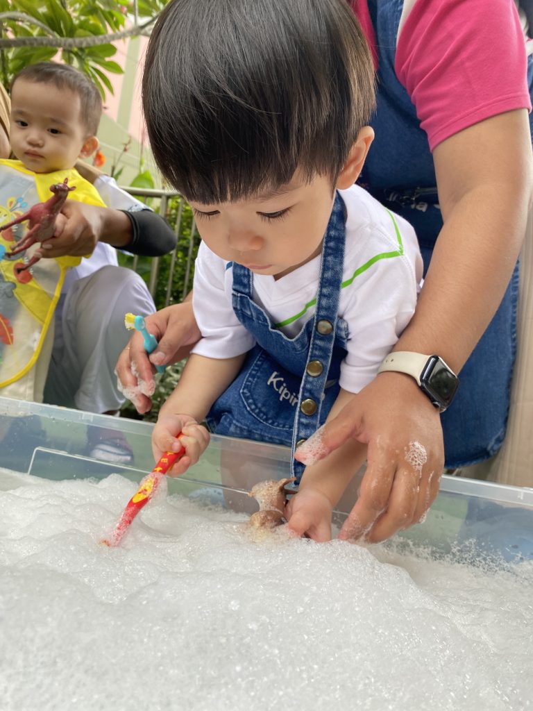 During the session, the babies explored a cleaning animals activity, where they used soft sponges, cloths, and water to gently clean toy animals. This hands-on experience allowed them to touch, feel, and interact with different textures while developing their sensory awareness.