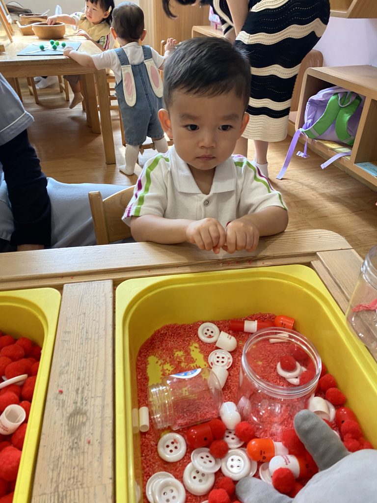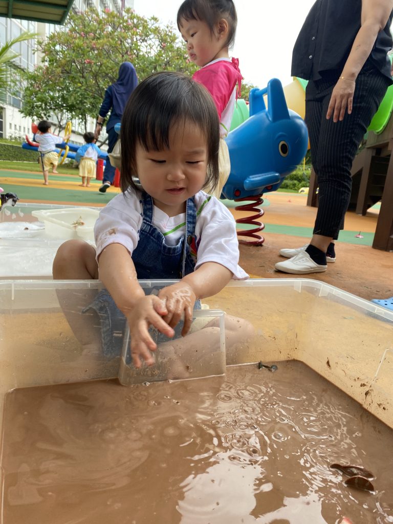 The activity supported babies’ fine motor skills as they grasped and squeezed sponges, as well as their hand–eye coordination through simple, guided movements. Teachers provided close support and verbal cues, helping babies feel comfortable and confident throughout the activity.