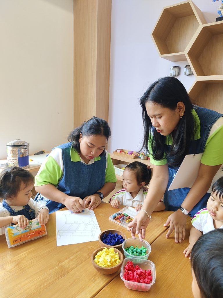 With guidance from their teachers, the children practiced fine motor skills as they picked up small pieces, applied glue, and carefully placed each colorful element onto their paper. At the same time, they were introduced to basic concepts such as colors, shapes, and everyday vocabulary related to fruits and vegetables.