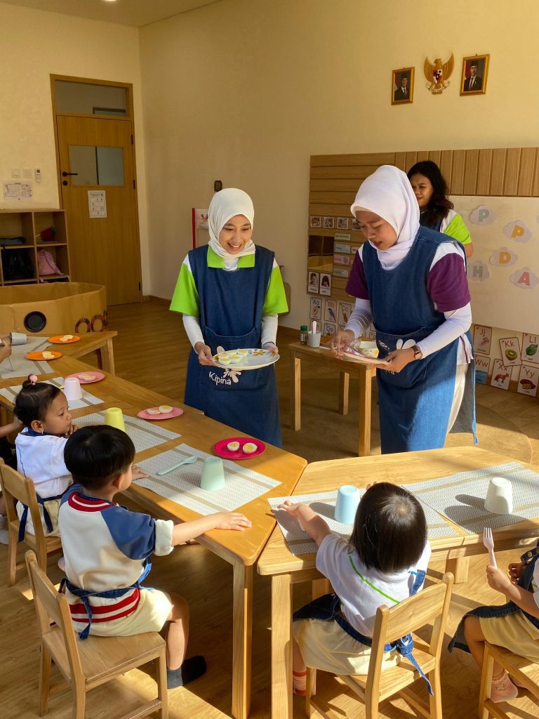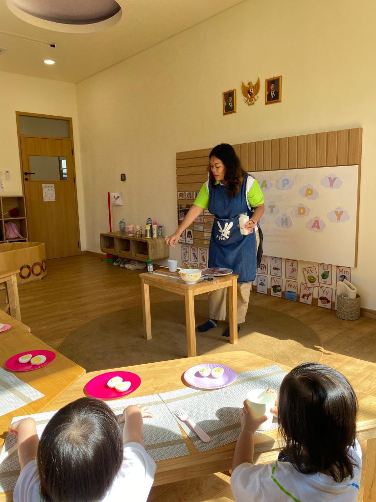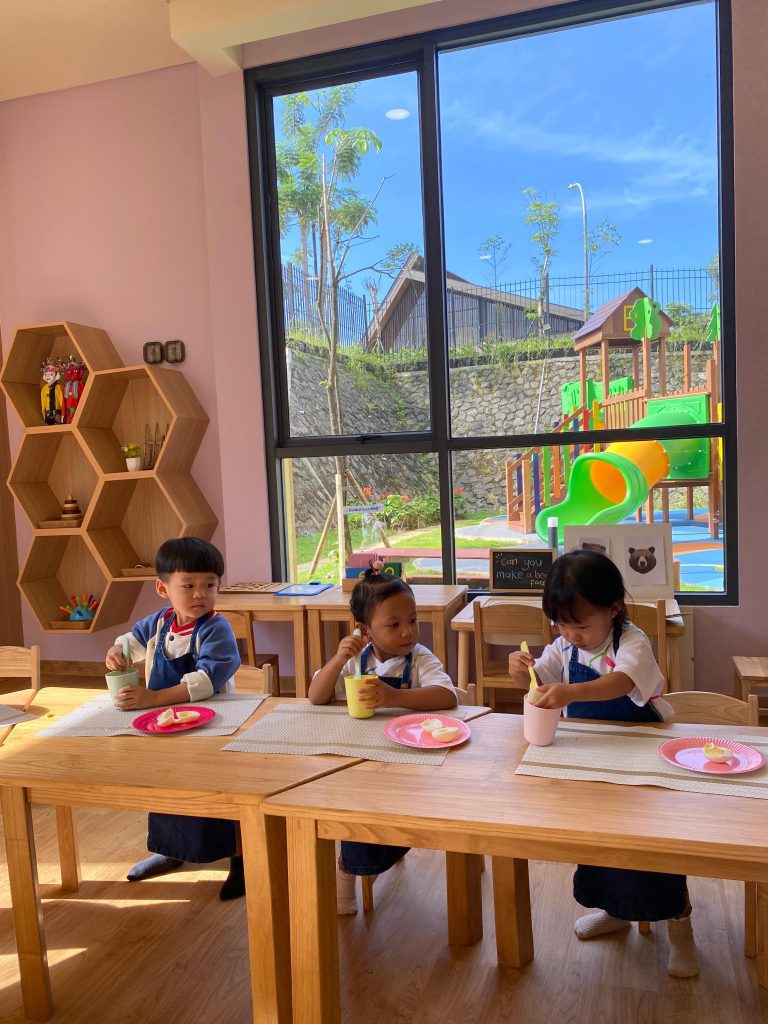 The Bears (Nursery 1) children had a wonderful time becoming little chefs during their fun cooking activity! After happily singing the nursery rhyme âRow, Row, Row Your Boat,â the children were invited to create their very own âsail boat egg.â With great excitement, they used a fork to mash the egg yolk until smooth, then carefully placed it into a piping bag and filled the center of the egg whites. To complete their creations, they added small sticks with colorful flags on top, turning their eggs into adorable little sailboats.